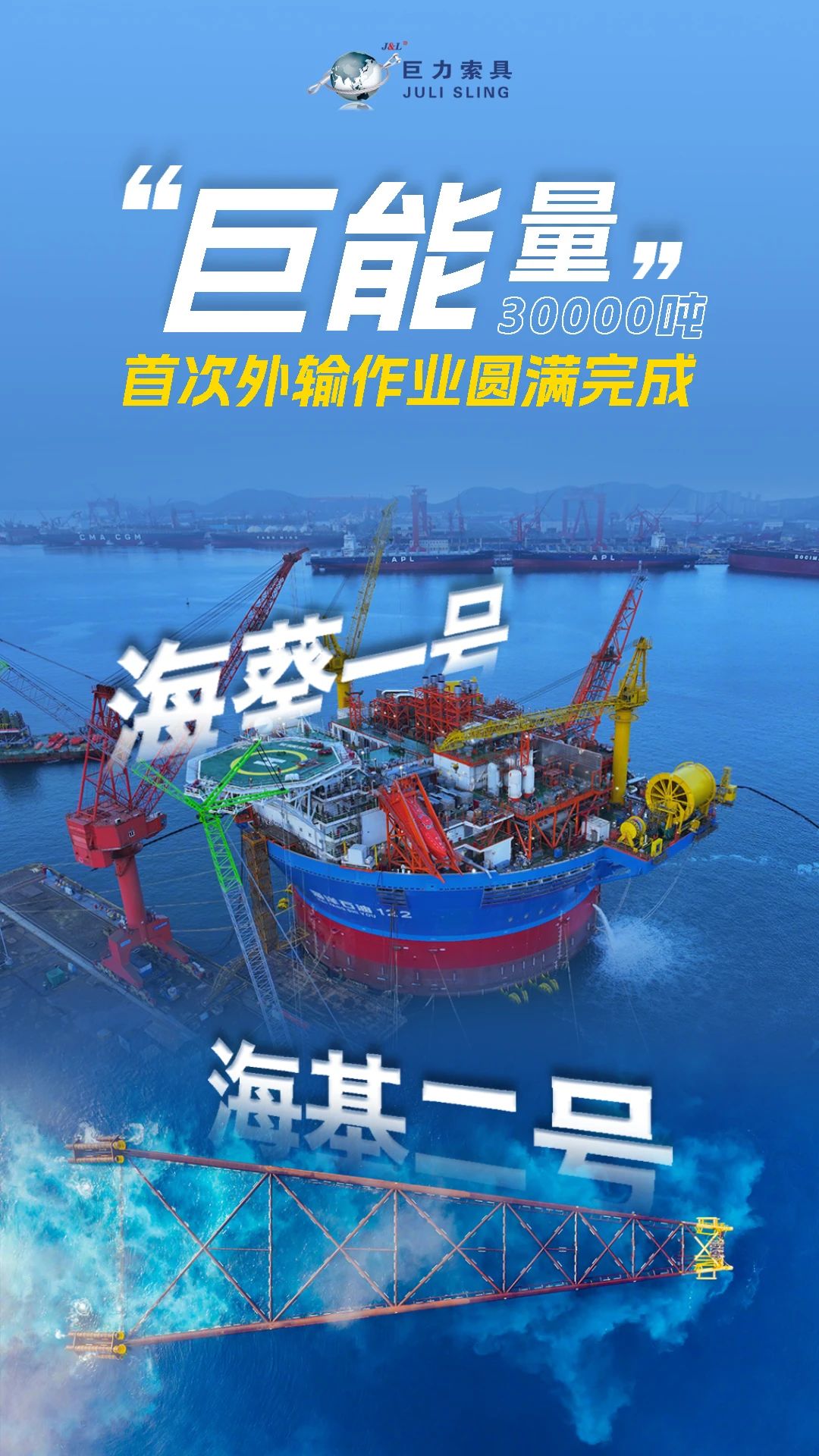 同时,巨力索具承担了“海基二号”的吊装工作。2024年3月,“海基二号”作为亚洲第一深水导管架,是亚洲高度最高、重量最大的导管架。巨力索具通过环形无接头绳圈等高性能产品,确保了导管架在深海中的稳定和安全,创造了固定式海洋平台重量、高度、作业深度等多项亚洲纪录。