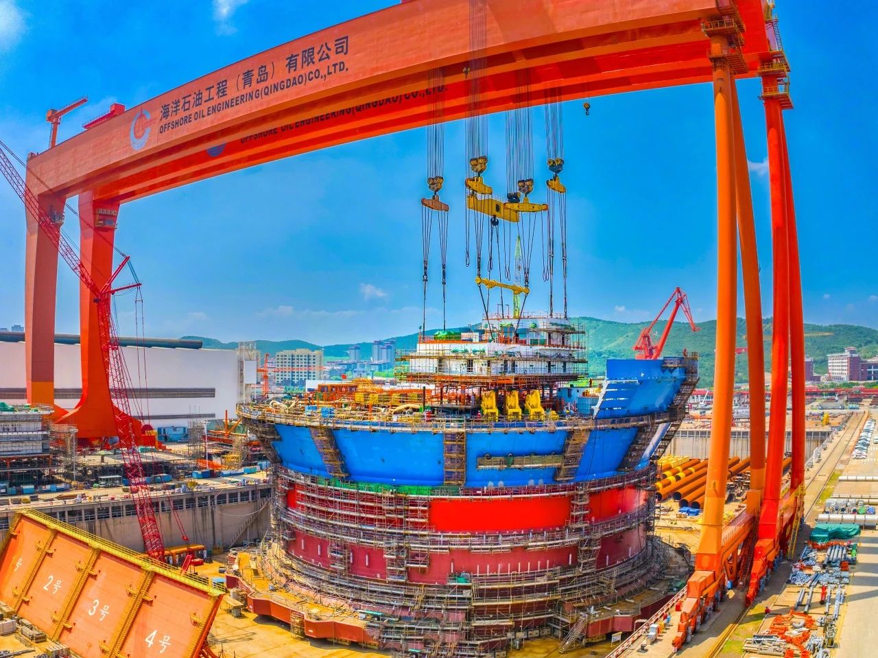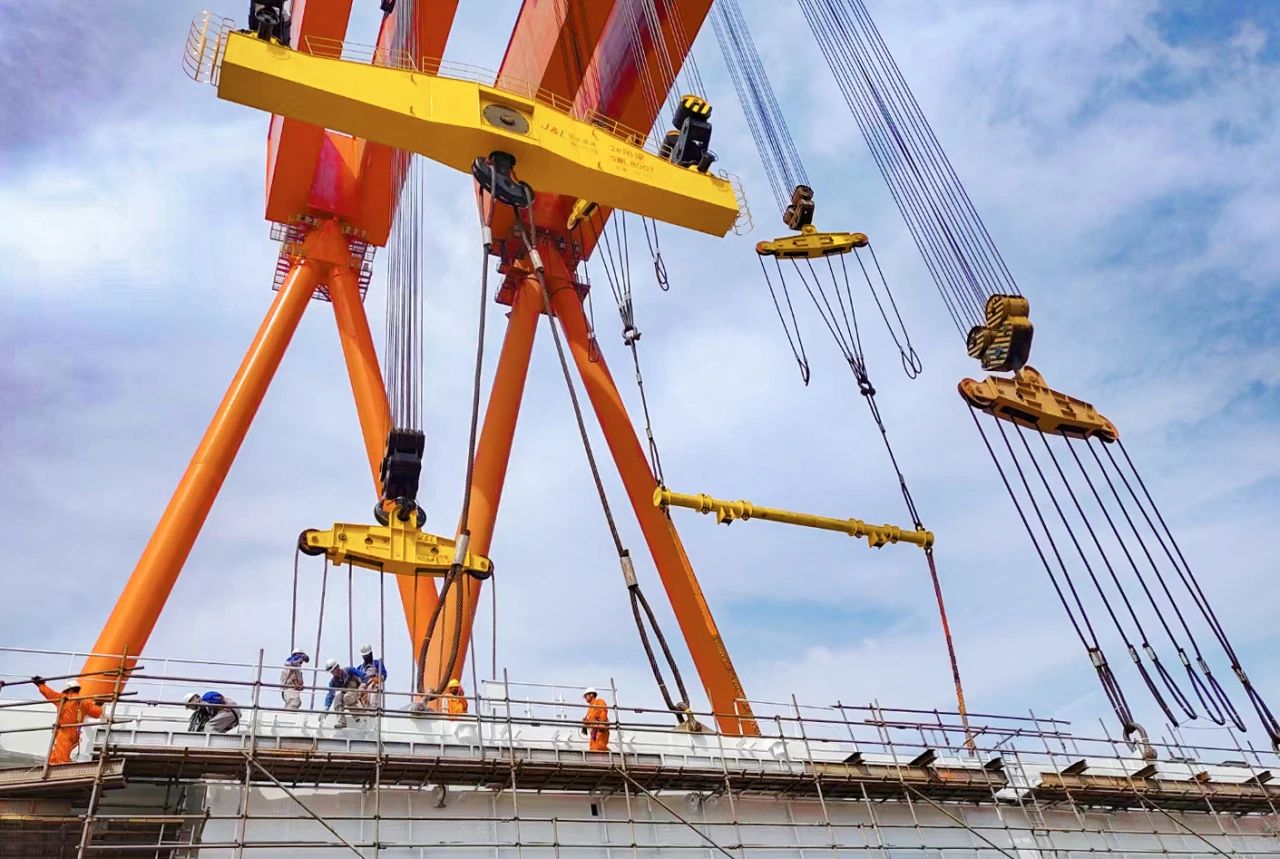 2023年12月,由我国自主设计建造的亚洲首艘圆筒型“海上油气加工厂”“海洋石油122”浮式生产储卸油装置——“海葵一号”超级能源碗在青岛完成主体建造,巨力索具提供800吨吊梁、400吨、500吨吊排及配套索具组成成套吊装系统,全程配合吊装顺利进行。