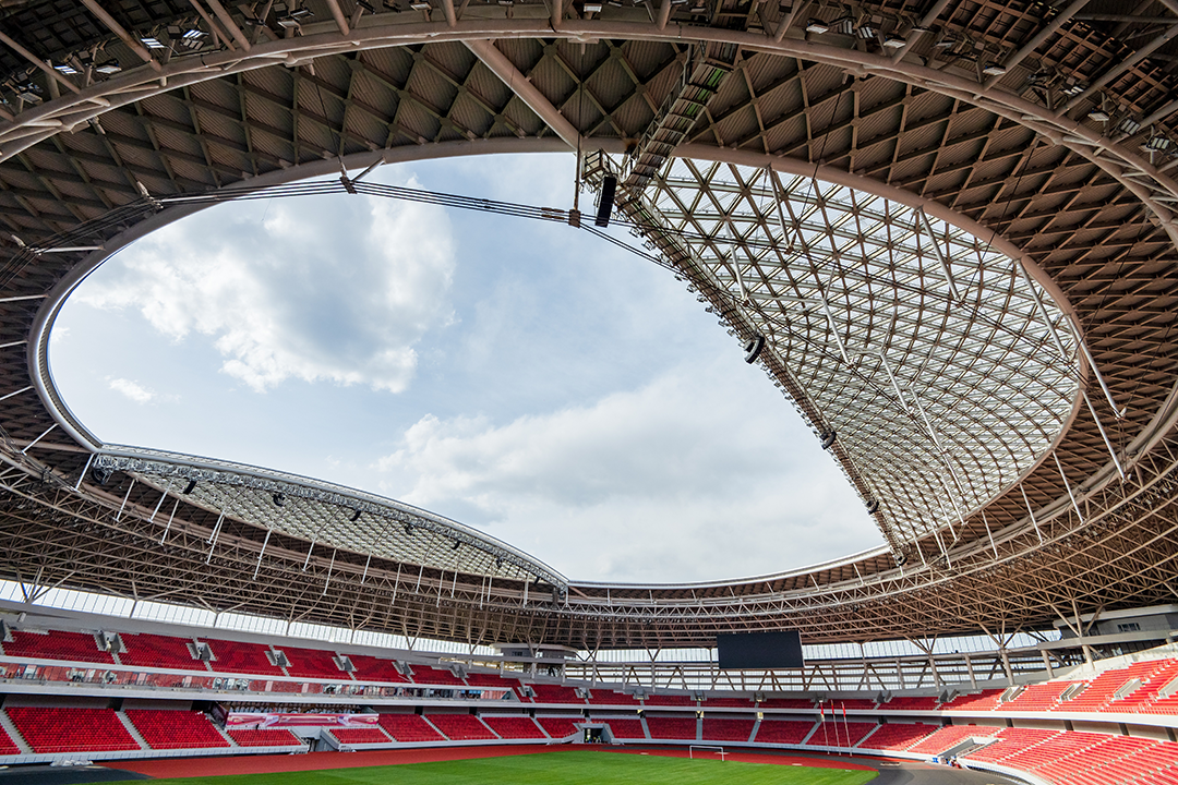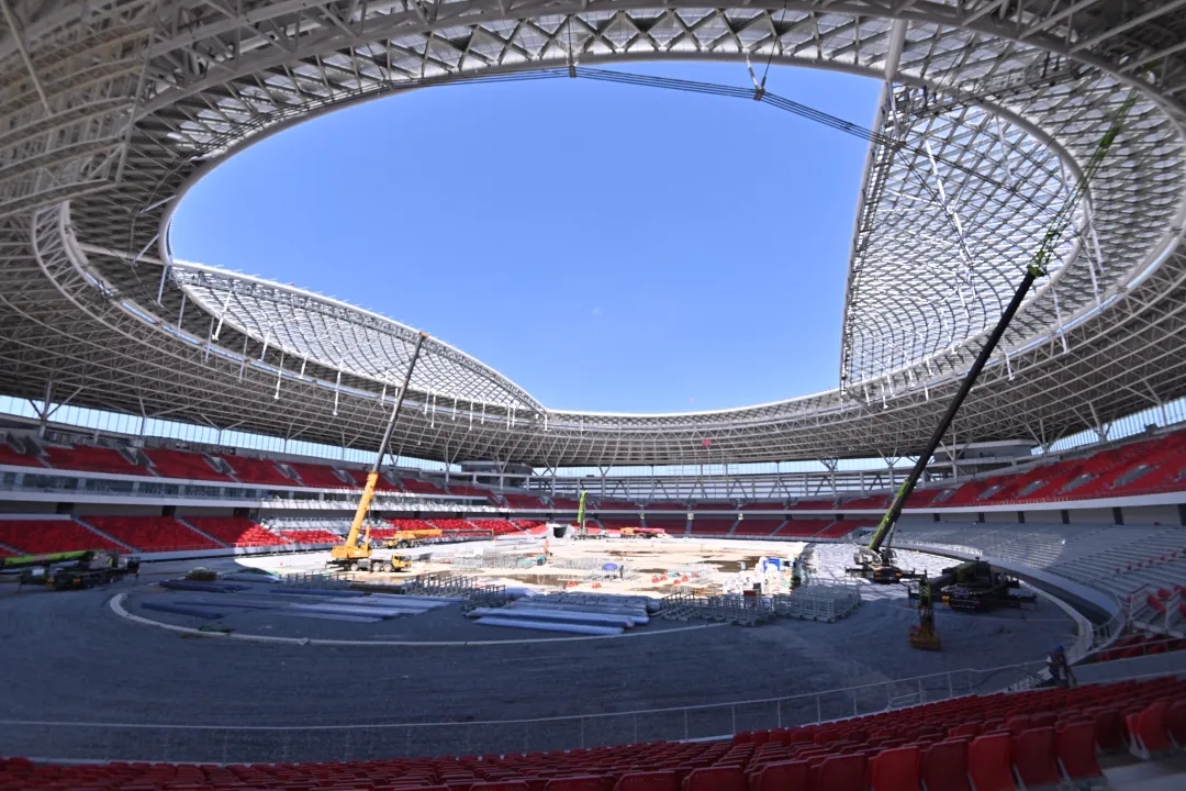 在建筑进行装修工程工作中,巨力索具对球场课公司径向索与环梁位置运用了测力销钉工艺(兼具拉索索力实时的监测数据系统职能,可确保球场课场建筑进行装修工程及运作阶段的索力监测数据系统),构建单双层网壳与索承张拉工艺,4700吨钢的结构屋盖综合吊升,建筑进行装修工程时在室内地坪組裝达成,56小毫米(mm)级准确落位,更新中国国内球场课体育中心建筑进行装修工程紀錄。