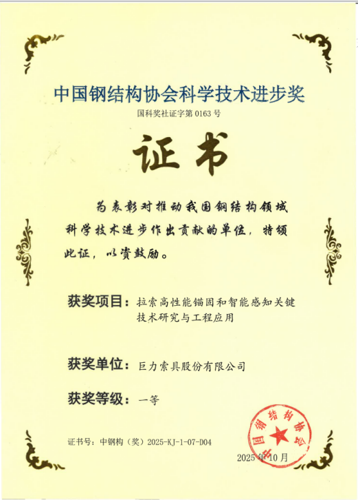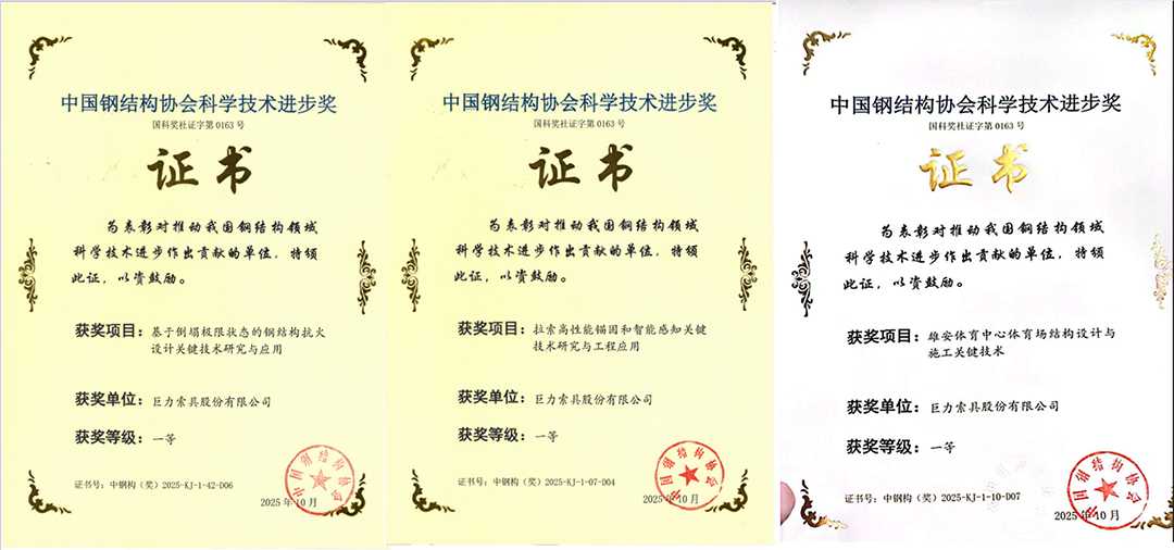 技术创新再获权威认可!巨力索具荣膺三项中国钢结构协会科学技术进步奖一等奖