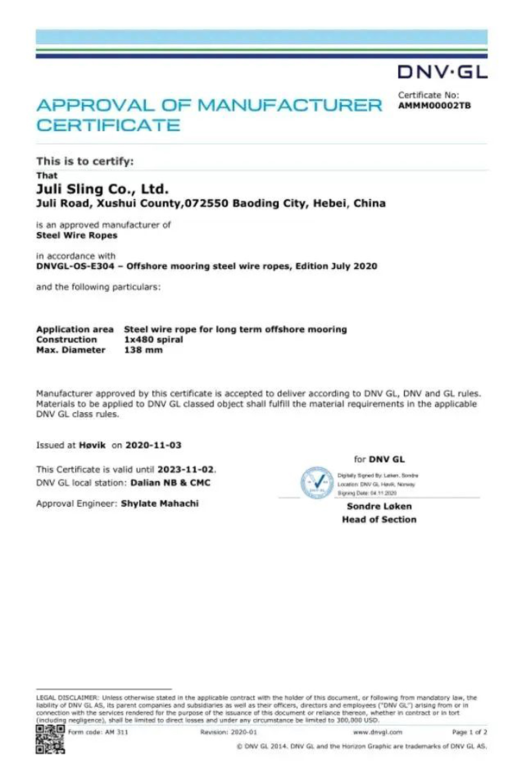 同时,巨力索具系泊产品通过了DNV·GL工厂认证成为国内首家通过该类钢丝绳DNV·GL工厂认可的厂家。系泊索各项指标达到了国际先进水平,标志着我国浮式海上风电永久系泊关键装备的研发设计、生产制造以及国产化上实现了新突破,为我国深远海浮式风电商业化发展以及关键技术及装备国产化奠定了坚实基础。