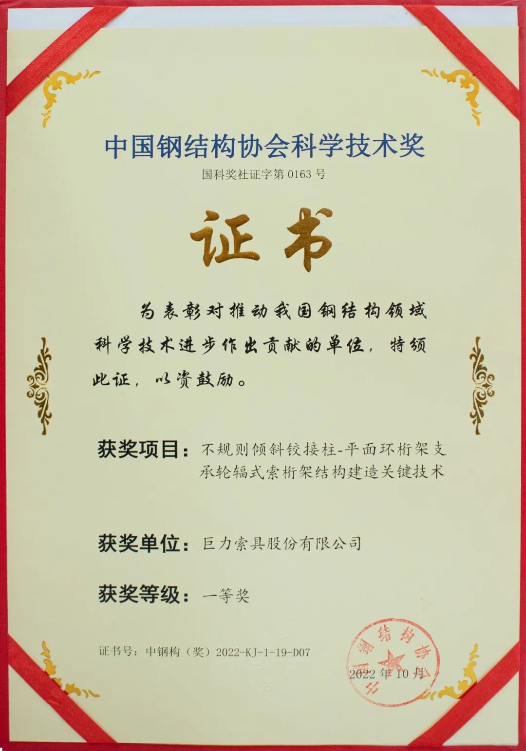 近日,中国钢结构大会暨粤港澳大湾区钢结构发展峰会在广州召开,会上进行了颁奖仪式。由巨力索具参与三亚国际体育中心项目完成的“不规则倾斜铰接柱-平面环桁架支承轮辐式索桁架结构建造关键技术”项目获得一等奖。进一步展现了我司在钢结构领域发展的创新实力。