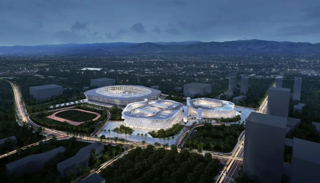 该体育场整体外轮廓平面投影为不规则的倒角五边形,其外轮廓南北最大长度约305米,东西约270米,罩棚最高点标高约46米。从体育场内的观众席处仰望,一根根钢索交织连接,各自用力拉伸,巨大钢网架跃然呈现,好似一座兼具了力学、美学、科技的艺术品。