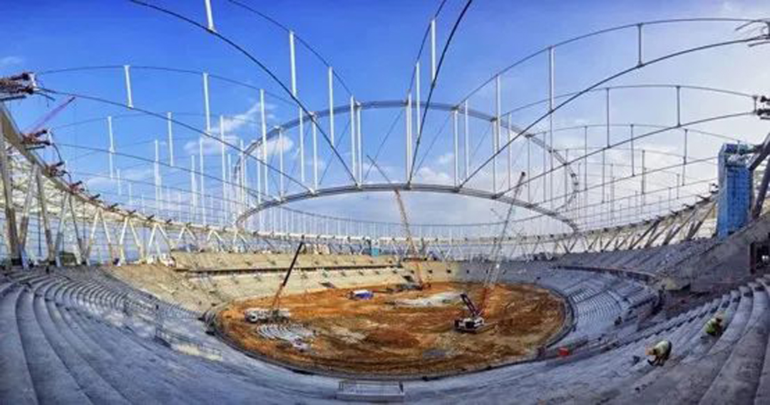 ▨体育场项目索结构采用双层轮辐式索桁架结构体系,该体系是由一道上拉环、一道下拉环、一道压环梁、52组内环交叉索及沿环向布置的52榀径向索桁架组成。该项目索桁架结构全部采用了国产高钒密闭索,屋面环索直径为80mm和110mm两种规格。施工使用的G10MnMoV6-3+QT2铸钢索夹,也是国内首次运用到建筑当中。