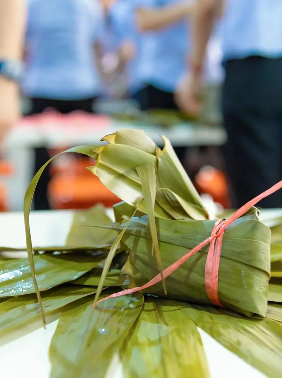 大家围聚在一起,现场气氛其乐融融。娴熟的“能手”,一手拿着粽叶,一手抓着糯米,将粽叶做漏斗状,填糯米,压紧实,封口,扎捆,巧手翻飞,动作麻利优美,还不忘时不时向身边的“新手”传授包粽子的要领。“新手”观看着、学习着,遇到“粽叶散了、绳子松了”等小问题还不住地向“高手”请教。
