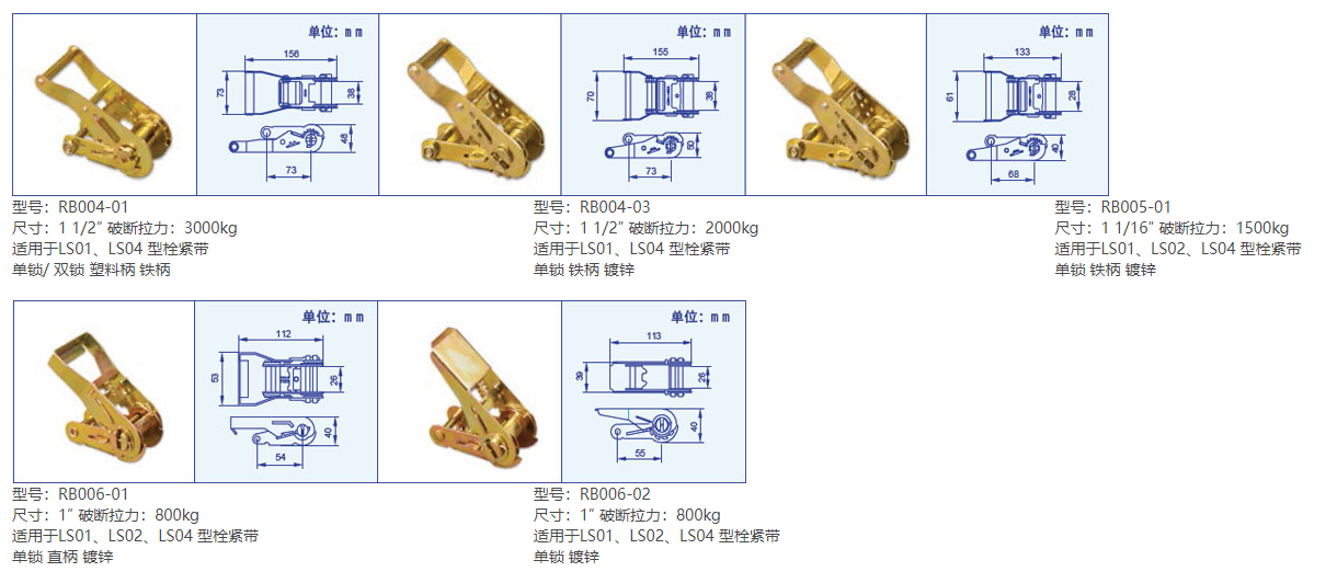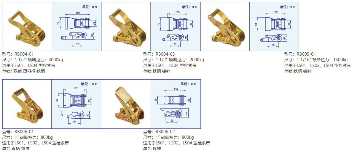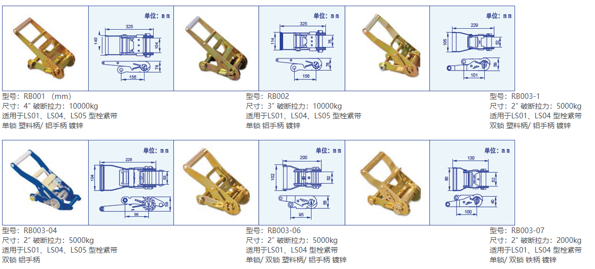 产品型号 适用尺寸 破断拉力(kg) 规格大小(mm) 表 面 适合型号